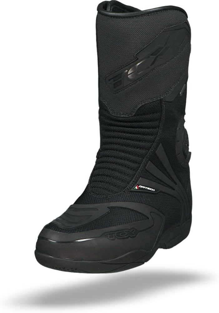 TCX Airtech Evo GTX er en veludviklet motorcykelstøvle, der kombinerer GORE-TEX membranens vandtætte og åndbare egenskaber med optimal ventilation. Den er lavet af slidstærkt mikrofiber og tekstil, hvilket sikrer let vægt og komfort under lange ture. Støvlen har forstærkninger ved ankler, hæl og tå for ekstra beskyttelse. Lynlås og velcrolukning giver en sikker og justerbar pasform. Airtech Evo GTX er ideel til motorcyklister, der søger komfort og beskyttelse under både varme og våde forhold.